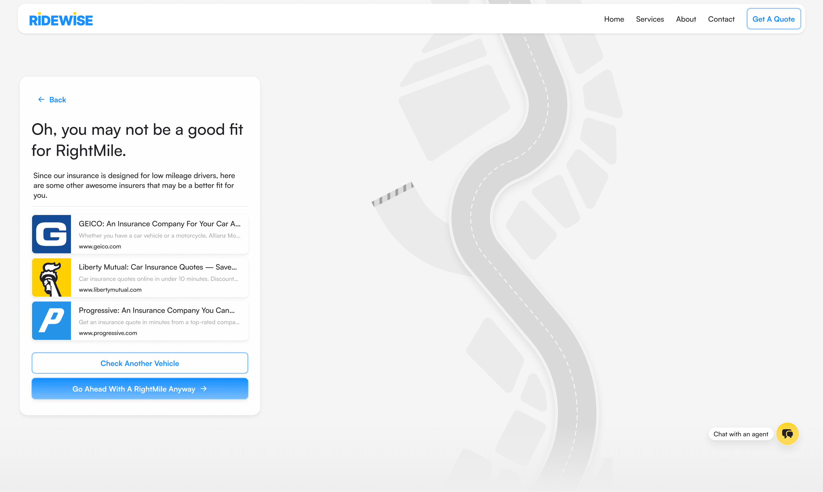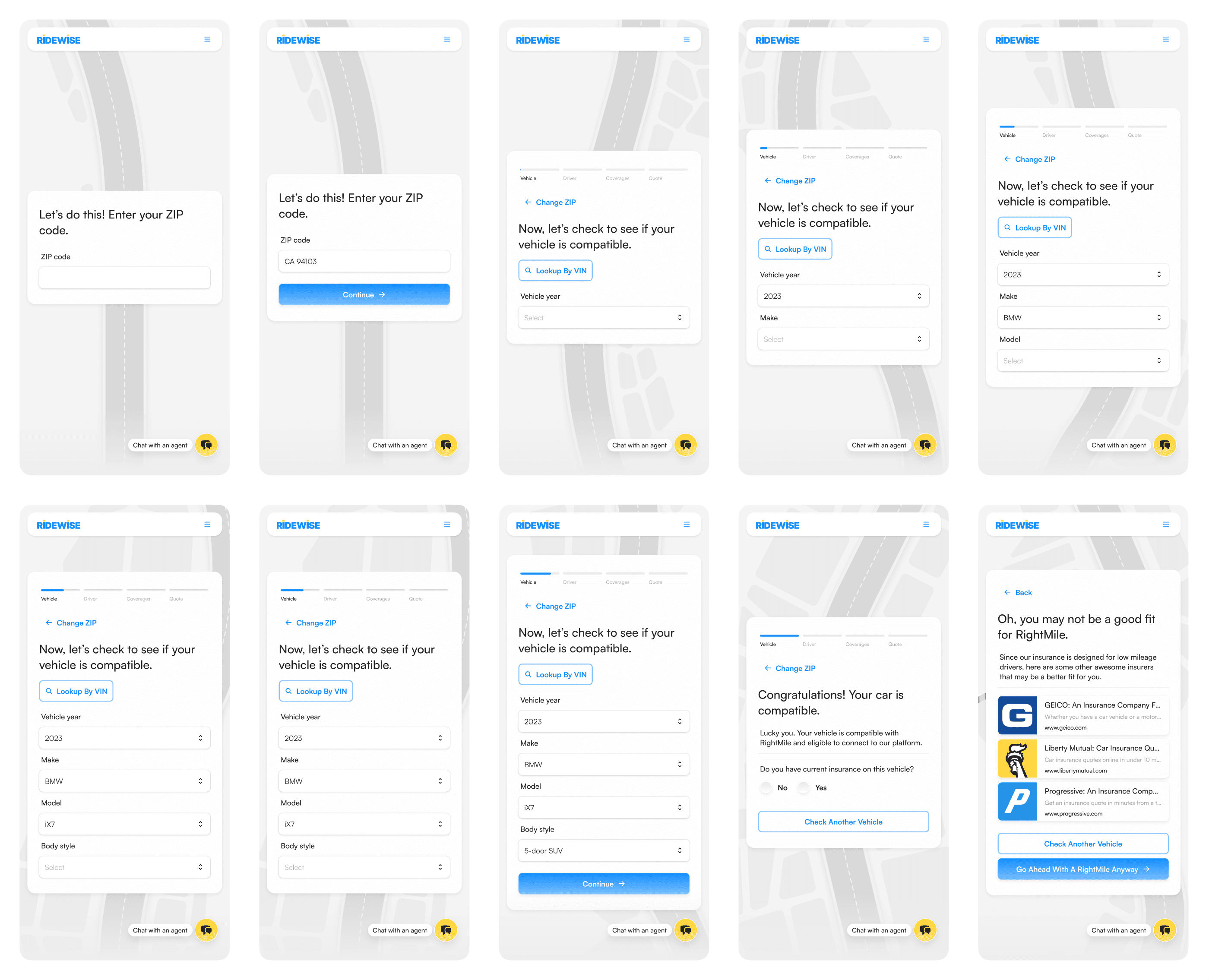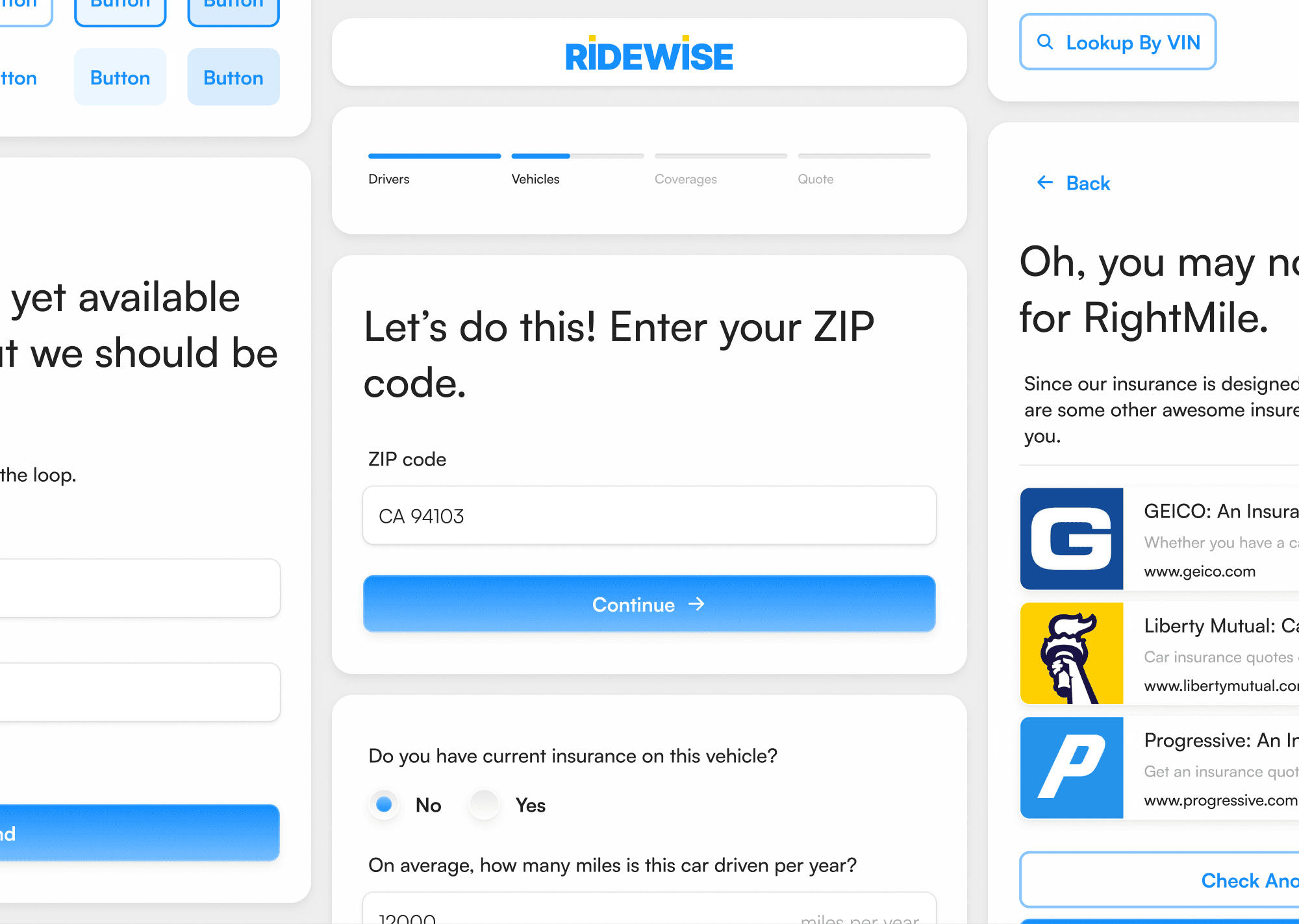 Ridewise was designed as part of a proposal for a US-based insurance company exploring coverage options for low-mileage vehicles. The challenge was to guide users through a traditionally complex and opaque insurance purchase flow while keeping the experience approachable and engaging.